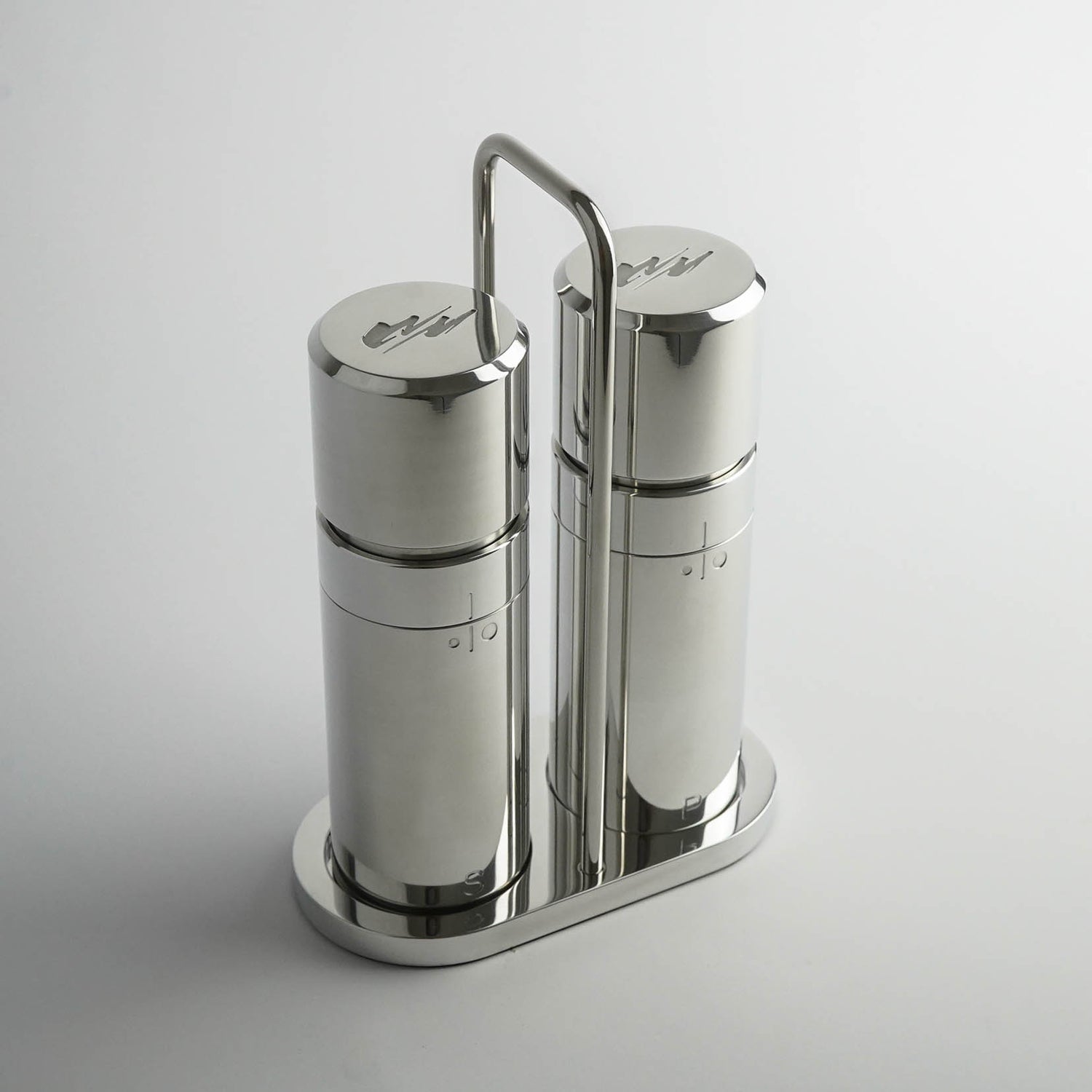 The Wagyumafia X WW MOULIN is made from solid machined and polished aerospace grade aluminum, with Stainless 316L internal pieces and accents. The burrs for the pepper mill are hardened tool steel for a lifetime of pepper showering, and the burrs for the salt mill are corrosion-free sintered ceramic with zirconia bearings.