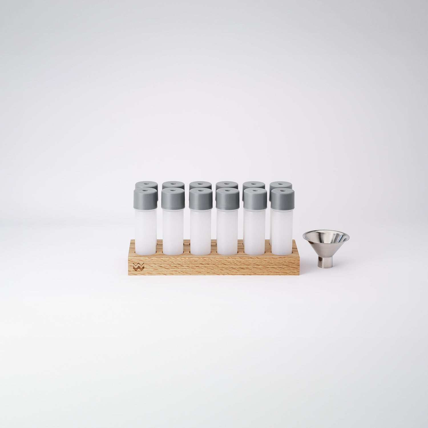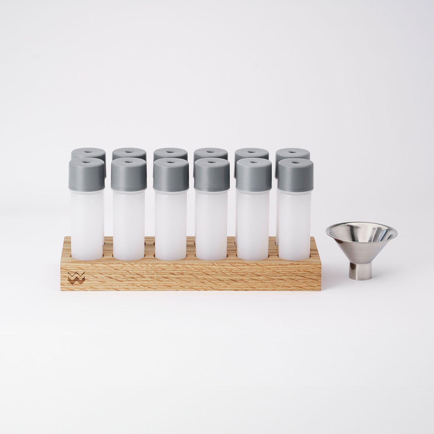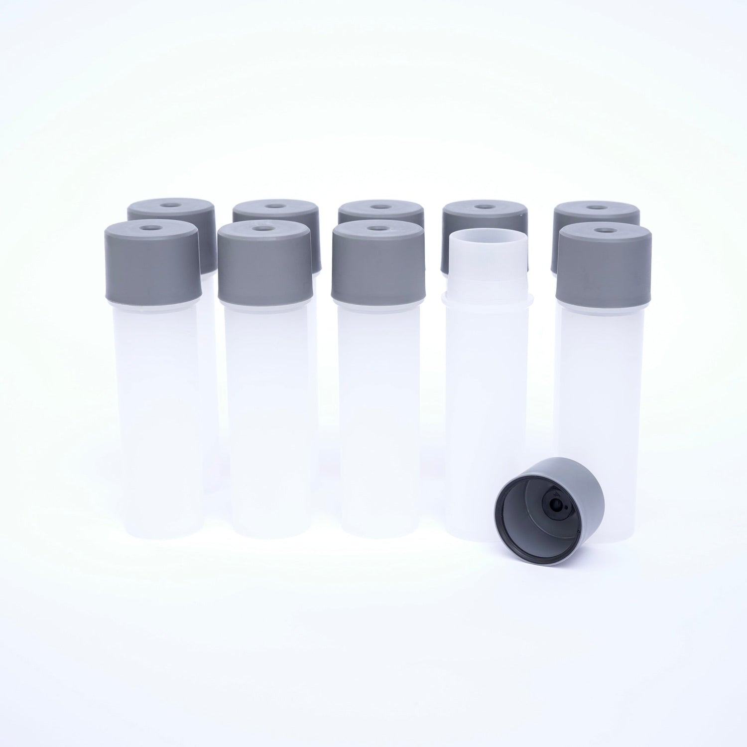 - Set of 10 or 12 food-grade polypropylene bean cellars and caps. Integrated seals and valves.