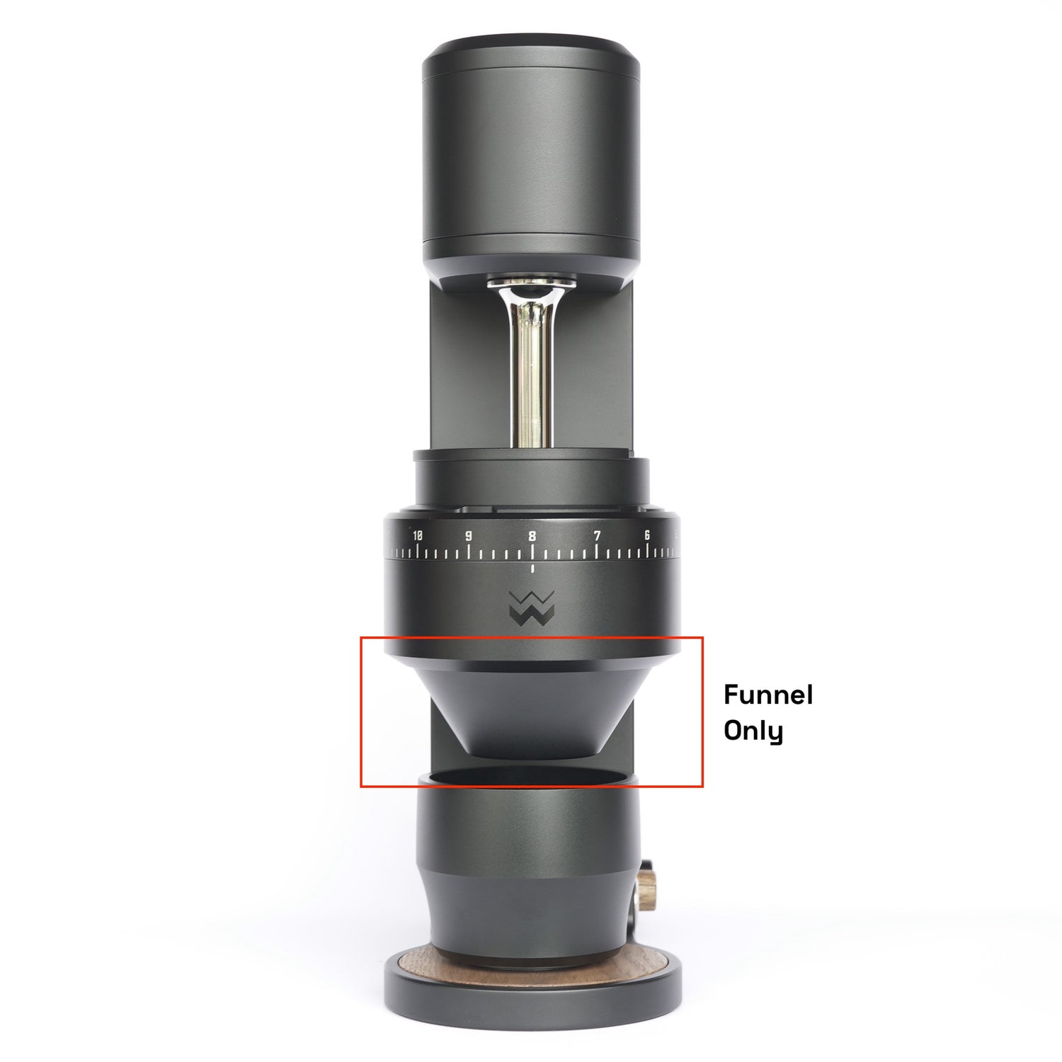 The Grounds Funnel attaches magnetically to the exit point of the burrs to channel the grounds into a standard tumbler, a blind shaker, or directly into a dosing cup or portafilter if you have it configured to do so. It is made from solid anodized aluminum with a polished interior wall to eliminate static retention. The neodymium magnets are embedded in the top rim. Comes with a static wiper also made with food-safe and anti-static resin.