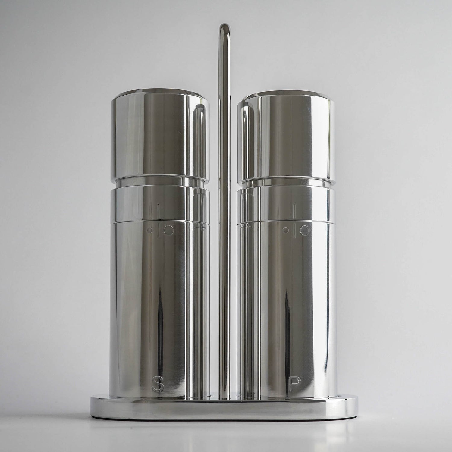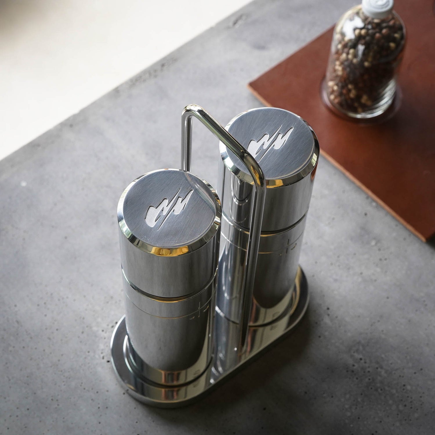 The Wagyumafia X WW MOULIN is made from solid machined and polished aerospace grade aluminum, with Stainless 316L internal pieces and accents. The burrs for the pepper mill are hardened tool steel for a lifetime of pepper showering, and the burrs for the salt mill are corrosion-free sintered ceramic with zirconia bearings.